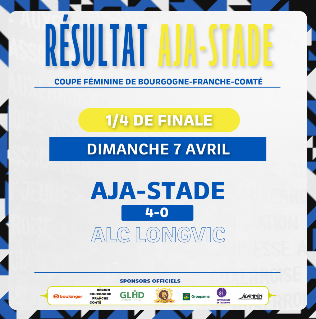 Les filles sont qualifiées pour les demi-finales de la Coupe féminine de Bourgogne-Franche-Comté ! Ce dimanche, nos féminines de l’AJA-Stade affrontaient l’ALC Longvic, pensionnaire de D3F. Milhad Sadikou et Loredana Stefut permettent de mener 2-0 à la mi-temps, puis c’est Gloria Mabomba et la capitaine Emma Faure qui creusent l’écart en seconde période (4-0). L’AJA-Stade affrontera le RC Lons pour une place en finale.
