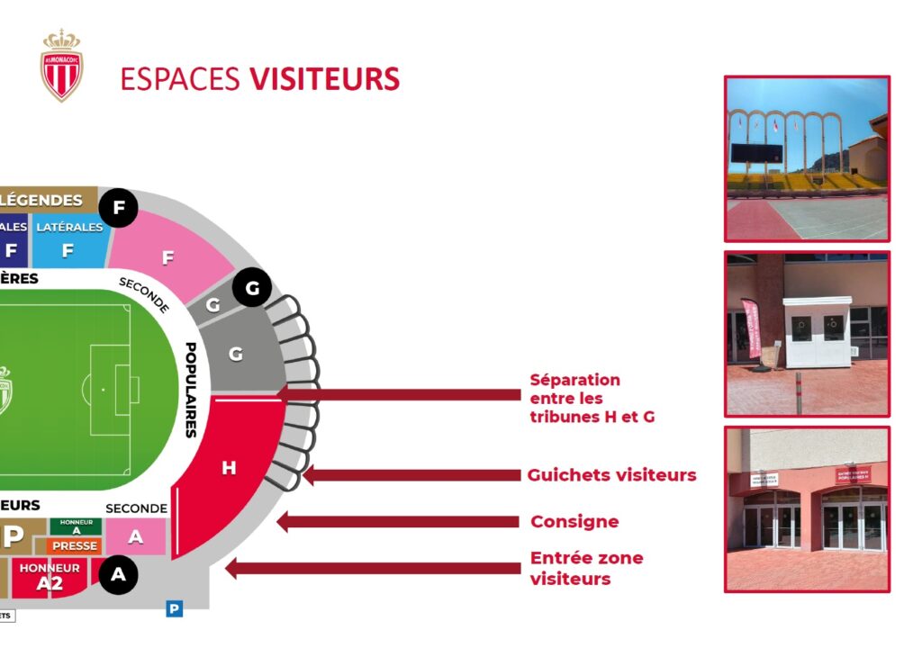 Le stade se situe 7 avenue des Castellans, 98000 Monaco. Le secteur visiteurs est en Populaires H.