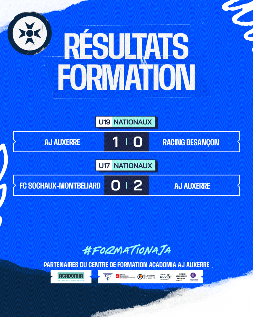 L’AJA affrontait ce week-end le FC Sochaux-Montbéliard en déplacement. Après avoir ouvert le score à la demi-heure de jeu, les garçons enfoncent le clou juste avant la pause. Une avance solide qu’ils gèrent ensuite en deuxième mi-temps pour s’imposer 2-0. Nos U17 occupent la 5ème place, à seulement trois points du leader, Strasbourg, qu’ils reçoivent au prochain match !